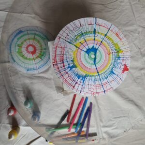 En este taller lxs niñxs podrán disfrutar del color y el movimiento, el brillo y la mezcla de colores que se produce de forma «automática» gracias a los dispositivos de movimiento. Se asombrarán con los cambios de forma y color que se producen entre el momento en que están produciendo las obras y el resultado final cuando la máquina se detiene.